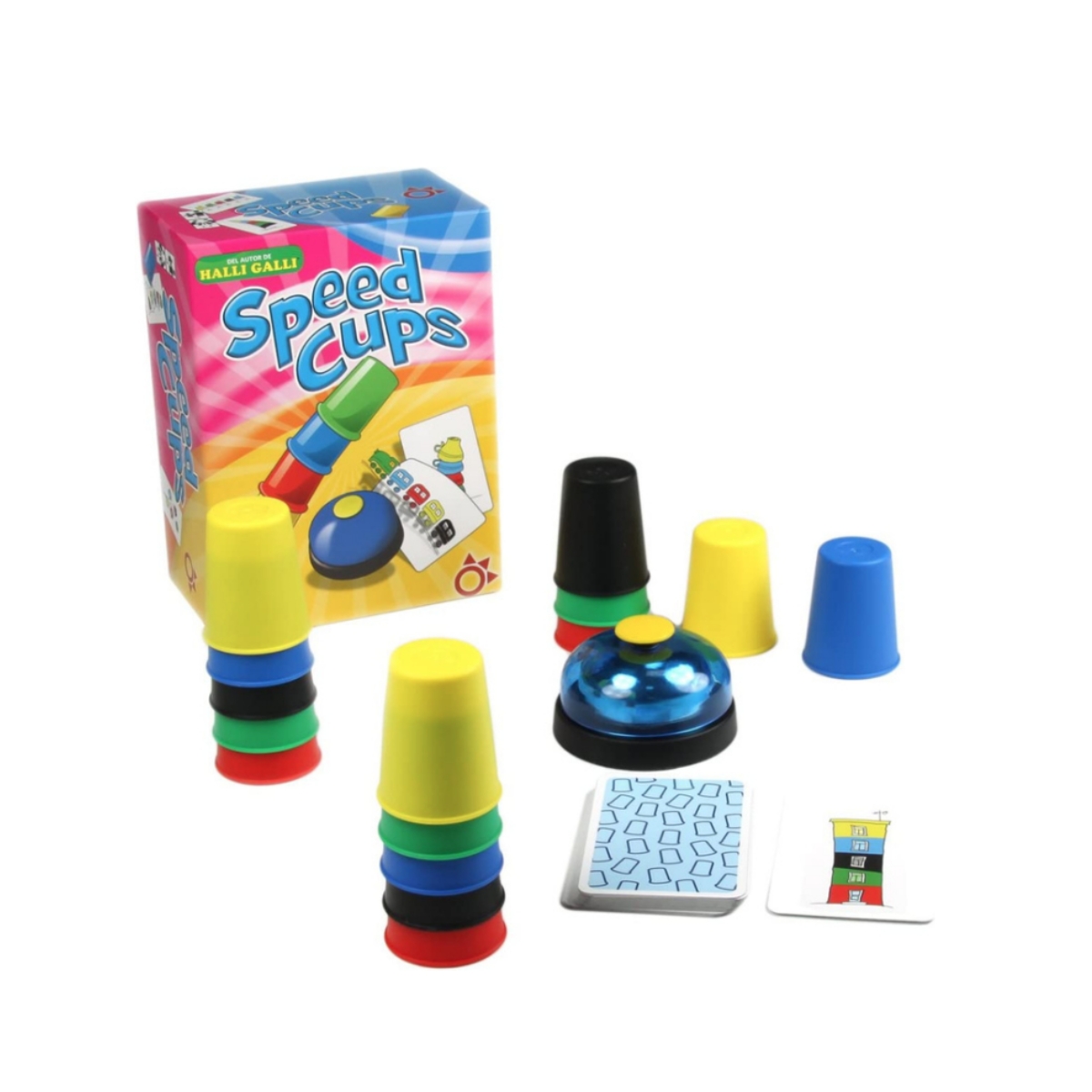 Juego de velocidad y habilidad. Reorganiza tus 5 cubiletes de colores siguiendo el patrón de la carta de objetivo. ¡Sé el más rápido en tocar el timbre!